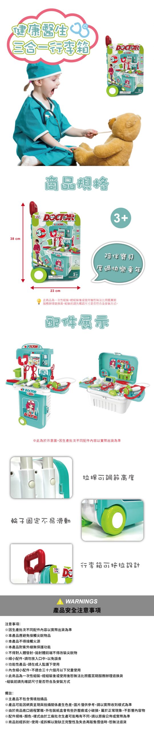 外盒即收納盒,培養孩子收納習慣 行李箱設計,外出遊玩輕巧好帶 融入情境,陪伴寶貝度過快樂童年 角色扮演,建立良好的親子互動 DIY貼紙,讓孩子玩得更有成就感 配件豐富、色彩鮮艷、安全無毒
