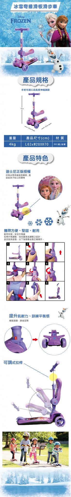 迪士尼正版授權 車輪加寬更平穩 提升兒童肌耐力、訓練平衡感 站著、坐著滑一車兩騎高C/P 手把可調三段高度伸縮調節 閃光PU輪一滑就亮 Frozen冰雪奇緣設計,讓寶貝隨時隨地都亮眼