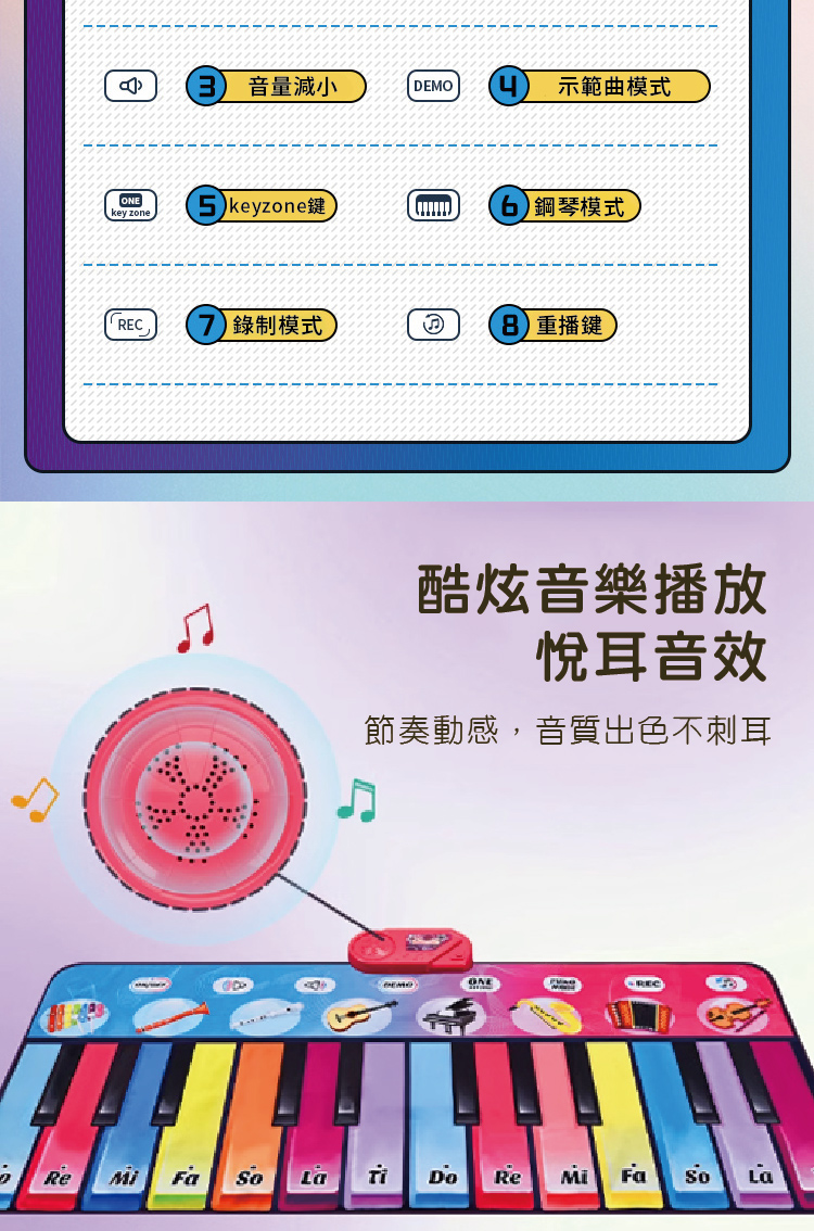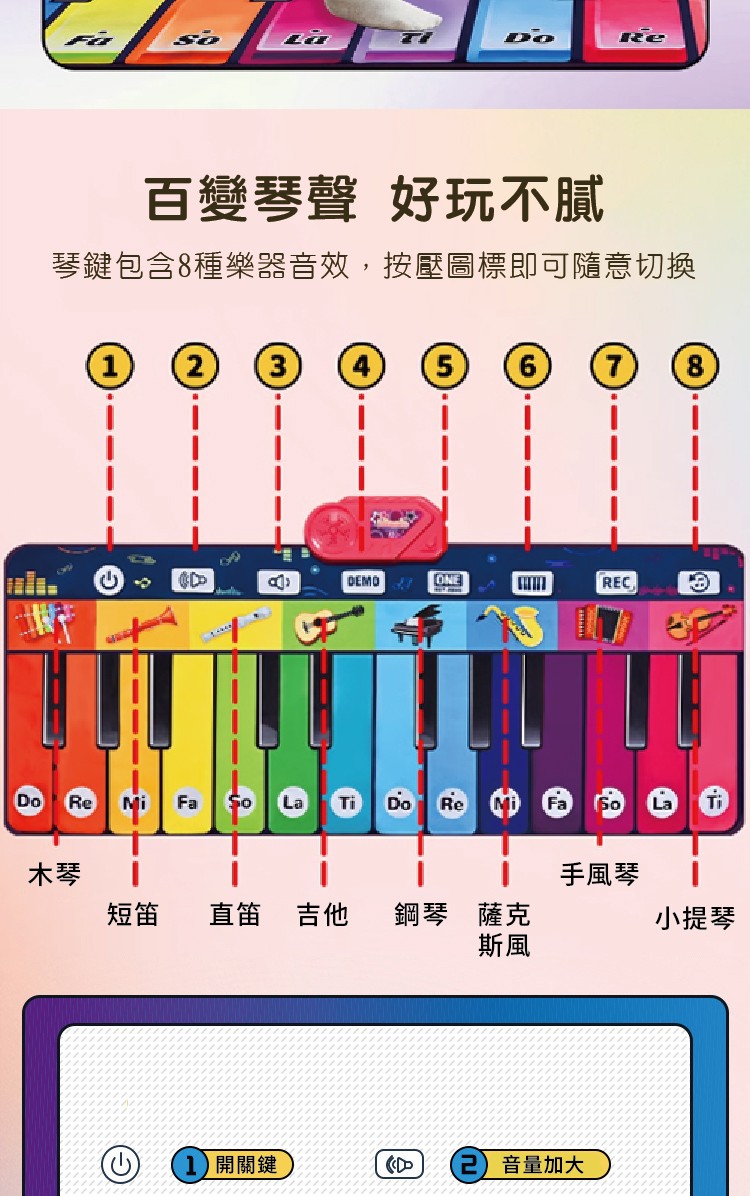 琴面加厚觸感舒適 寶寶啓蒙早教樂器 孩子玩樂同時培養興趣自然學習 可彈奏8種樂器聲,打擊樂器模式多首示範曲 具錄音和播放功能
