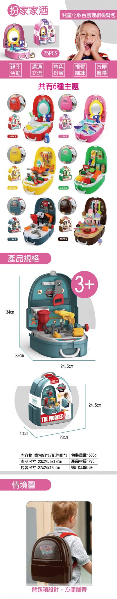 內容物:背包組*1、配件組*1 產品尺寸:23×24.5×13 cm 包裝尺寸:27x24x13 cm 包裝重量:600g 產品材質:環保PVC 適用年齡:三歲以上