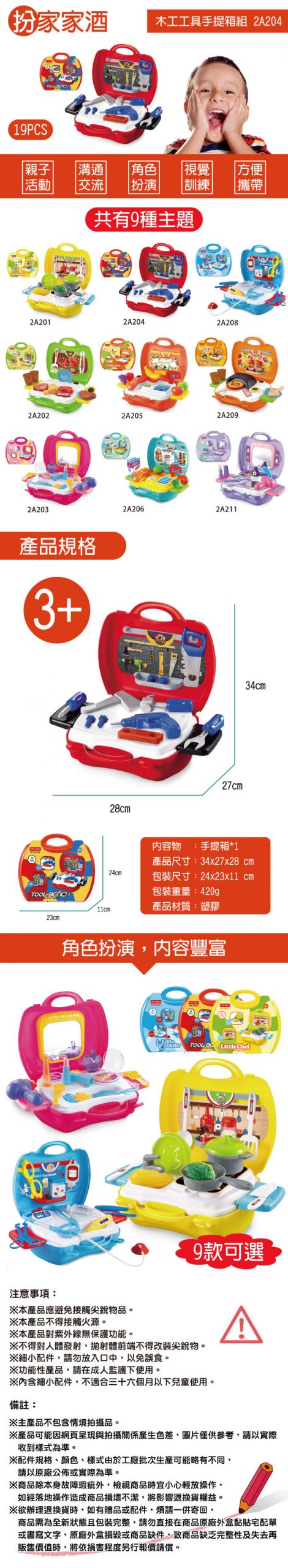 外盒即收納盒,培養孩子收納習慣 手提箱設計,外出遊玩輕巧好帶 融入情境,陪伴寶貝度過快樂童年 角色扮演,建立良好的親子互動 DIY貼紙,讓孩子玩得更有成就感 配件豐富、色彩鮮艷、安全無毒