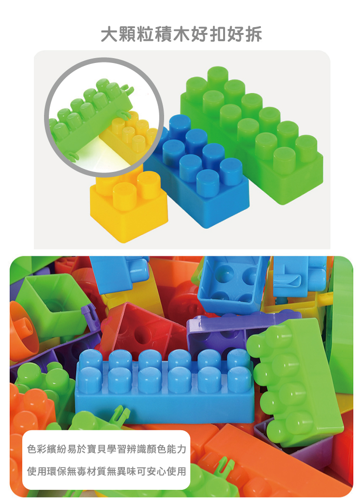 內容物:積木桶x1 約130片±2片 產品尺寸:24x24x19 cm 包裝尺寸:24x24x19 cm 包裝重量:700 g 產品材質:安全塑膠 適用年齡:3歲以上 產地製造:中國