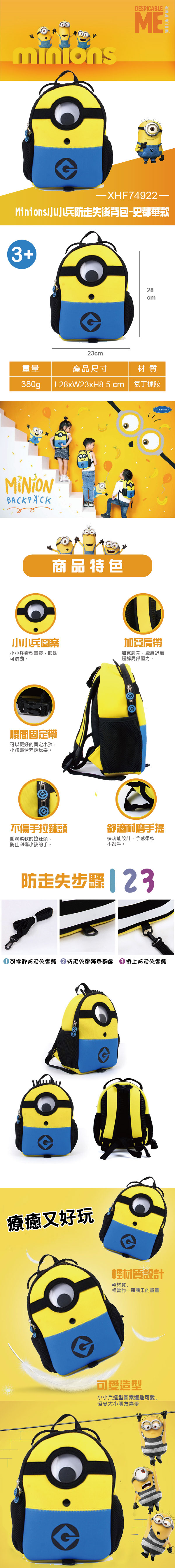 Minions正版授權品牌 防潑水材質,舒適耐磨好背 輕材質,相當約一顆蘋果的重量 顏色鮮豔,可愛討喜的小小兵造型 夾層收納空間,整理東西能一目了然 肩帶加厚、加寬,透氣又減壓 訓練孩子學習保管好自己的物品,養成好習慣 安全牽繩設計,讓您與孩子可以輕鬆走在擁擠人群中