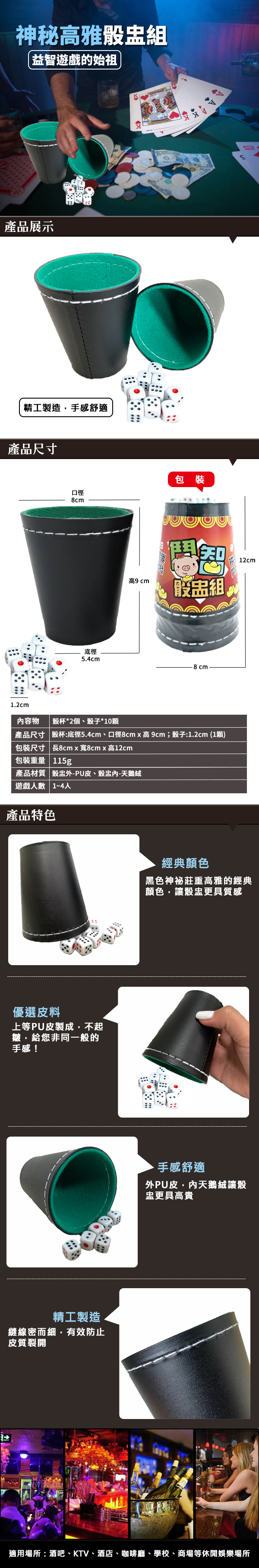 益智遊戲的始祖,健康的智慧寶典,體驗腦與手的運動 黑色神祕莊重高雅的經典顏色,讓骰盅更具質感 優選皮料,上等PU皮製成,不起皺不破皮,給您非同一般的手感 外PU皮,內天鵝絨讓骰盅更具高貴 精工製造,手感舒適,縫線密而細,有效防止皮質裂開