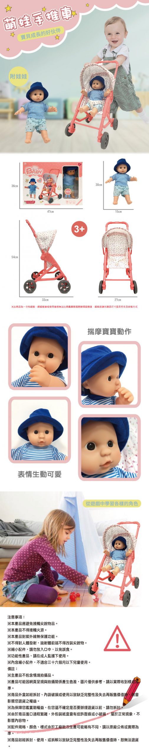 內容物:手推車x1 娃娃人偶 x1 產品尺寸:車33x27x54 cm 娃娃30×15 cm 包裝尺寸:47x11x36 cm 包裝重量:1200g 產品材質:安全塑膠 適用年齡:三歲以上 產地製造:中國