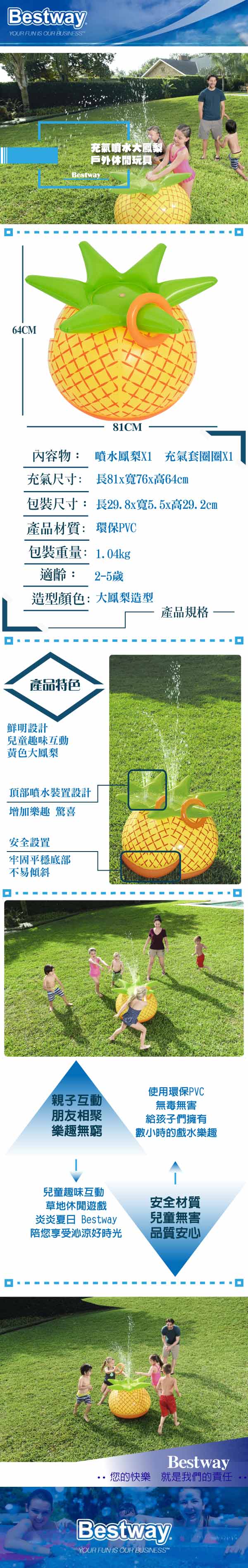 *兒童趣味互動、草地休閒遊戲 *鮮艷超吸睛的黃色大鳳梨,給孩子們擁有數小時的戲水樂趣 *頂部有一個噴水裝置 *牢固平穩底部,不易傾斜 *炎炎夏日,Bestway陪您享受沁涼好時光 *高韌性PVC材質製造,安全無毒,耐沙耐髒好清洗。