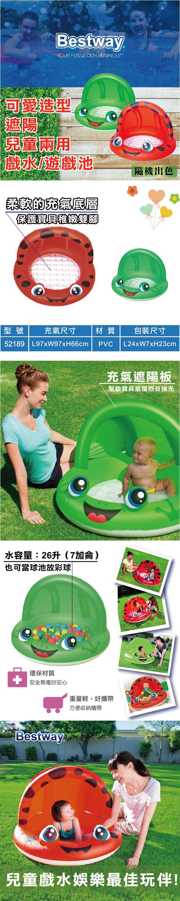 搶先評論了 “Bestway。可愛造型遮陽兒童兩用充氣戲水遊戲池”