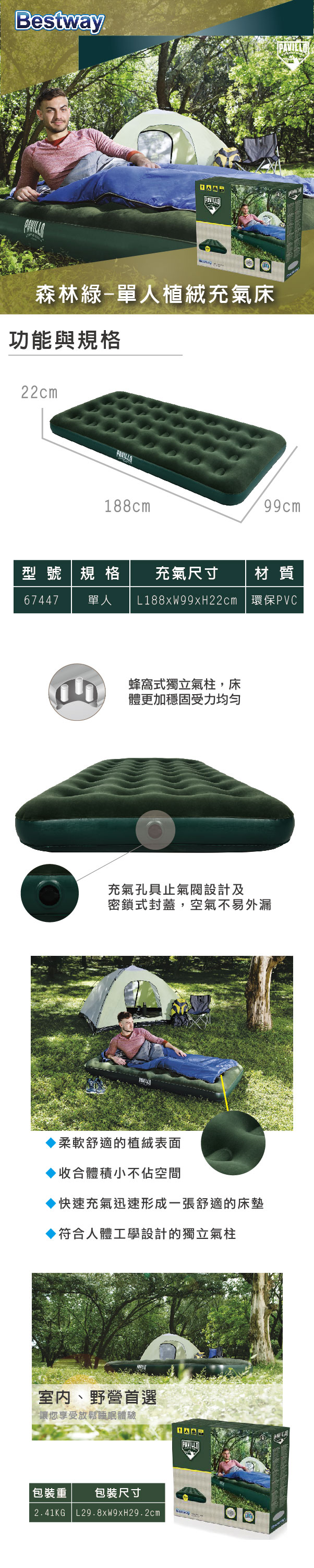 *蜂窩式獨立氣柱,床體更加穩固受力均勻 *柔軟舒適的植絨表面 *收合體積小不佔空間 *居家睡眠、外出旅遊、旅館加床、朋友寄宿,必備佳品 *快速充氣迅速成為一張舒適的床墊 *符合人體工學設計的獨立氣柱高級植絨充氣床 *充氣孔具止氣閥設計及密鎖式封蓋,空氣不易外漏