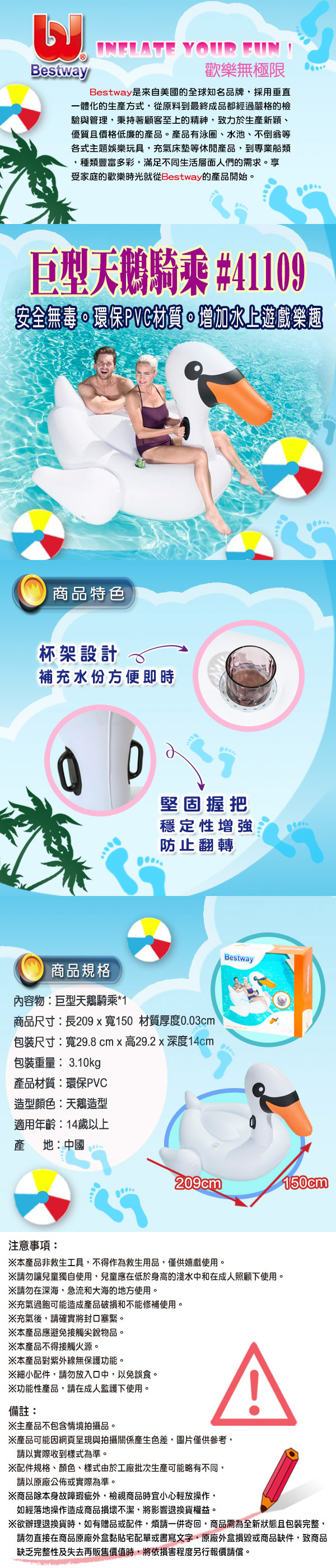 Bestway。巨型天鵝成人充氣騎乘/坐騎