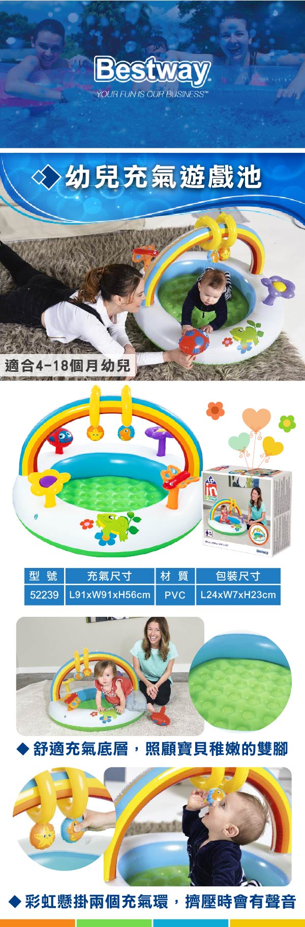 *兒童戲水娛樂最佳玩伴! *環保PVC材質製造 *適合4-18個月幼兒 *彩虹懸掛兩個充氣環,擠壓時會有聲音 *花環和動物4個獨立的玩具亦可裝飾 *柔軟的充氣底部提供更多的舒適性 *做工精細,外表平滑不銳利,使用更舒適