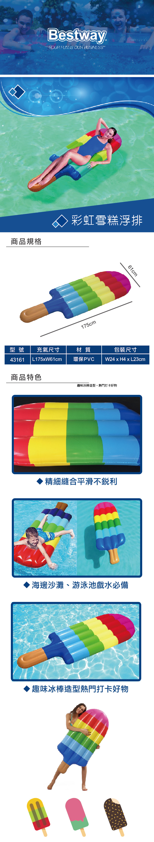 *防漏氣安全閥門 *趣味冰棒造型,熱門打卡好物 *做工精細內翻縫合,外表平滑不銳利 *炎炎夏日海邊沙灘、游泳池戲水必備 *使用塑料柔軟有彈性,耐磨耐用不易損壞