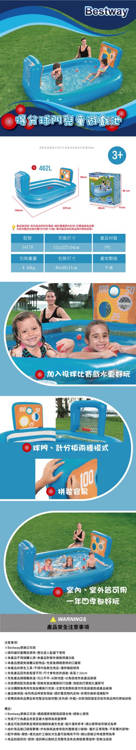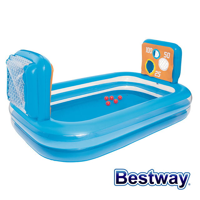 加入投球比賽戲水更好玩 球門、計分板兩種模式 外表平滑不銳利,使用更舒適 環保PVC材質製造,安全無毒 戲水、球池/室內、室外皆可用,一年四季都好玩