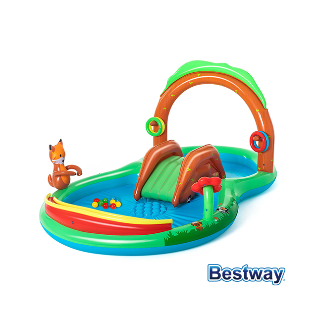 商品特色敘述: 附滑梯、噴水器、充氣狐理、彩球、套圈圈 叢林場景造型 外表平滑不銳利,使用更舒適 環保PVC材質製造,安全無毒 戲水、球池/室內、室外皆可用,一年四季都好玩