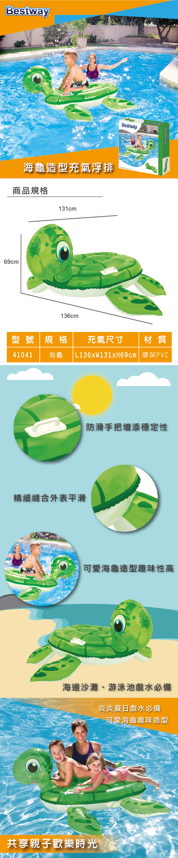 *防滑手把增添穩定性 *可愛海龜造型趣味性高 *做工精細內翻縫合,外表平滑不銳利 *炎炎夏日海邊沙灘、游泳池戲水必備 *使用塑料柔軟有彈性,耐磨耐用不易損壞