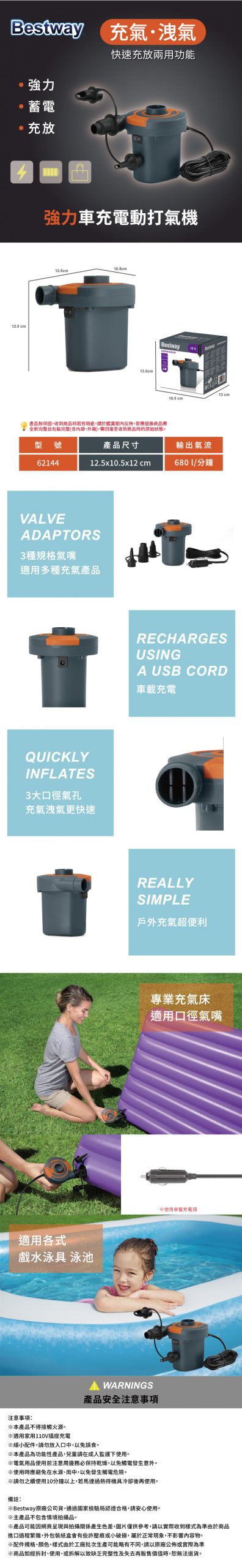 商品特色敘述: 車上電壓專用,適用電壓12V 輕巧便利戶外充氣超輕鬆 具快速充氣及排氣兩用功能 3種規格氣嘴,替換方便 大口徑氣孔,充氣、洩氣更快速 可用於充氣床、充氣玩具、充氣泳池等