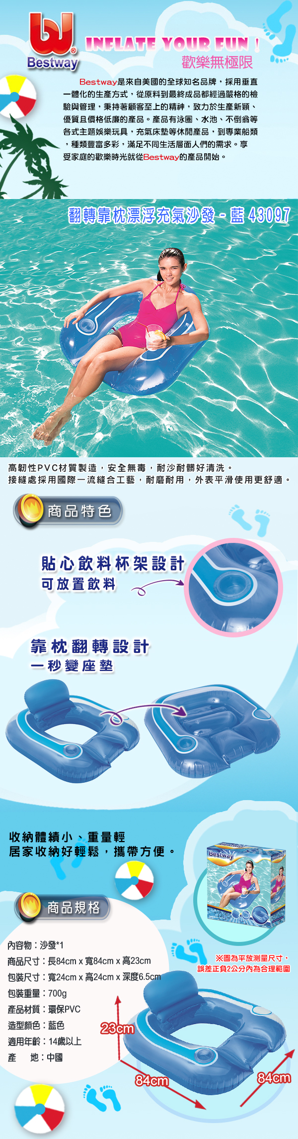 搶先評論了 “Bestway。翻轉靠枕漂浮充氣沙發 43097”