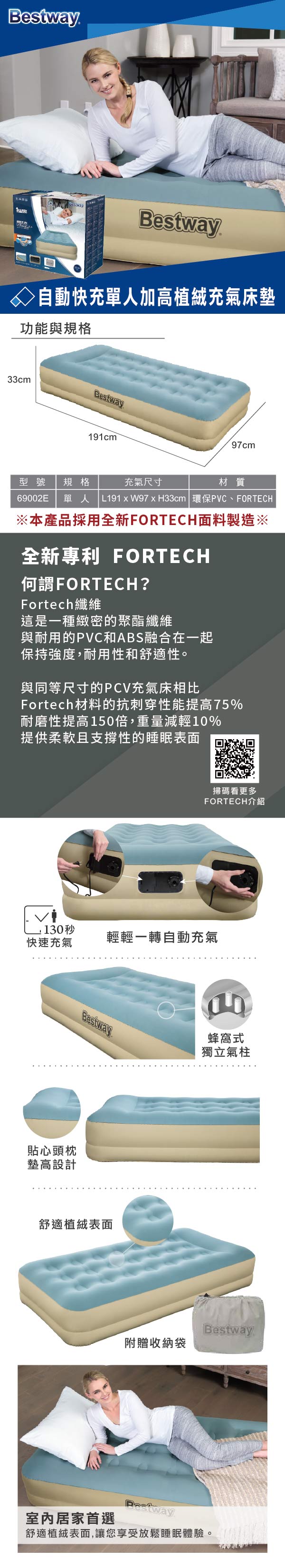 *全新專利FORTECH面料 *柔軟舒適的植絨表面 *貼心頭枕墊高設計 *蜂窩式獨立氣柱,床體更加穩固受力均勻 *內置電動打氣渠,約130秒快速完成充氣 *居家睡眠、外出旅遊、旅館加床、朋友寄宿,必備佳品 *附贈時尚收納袋