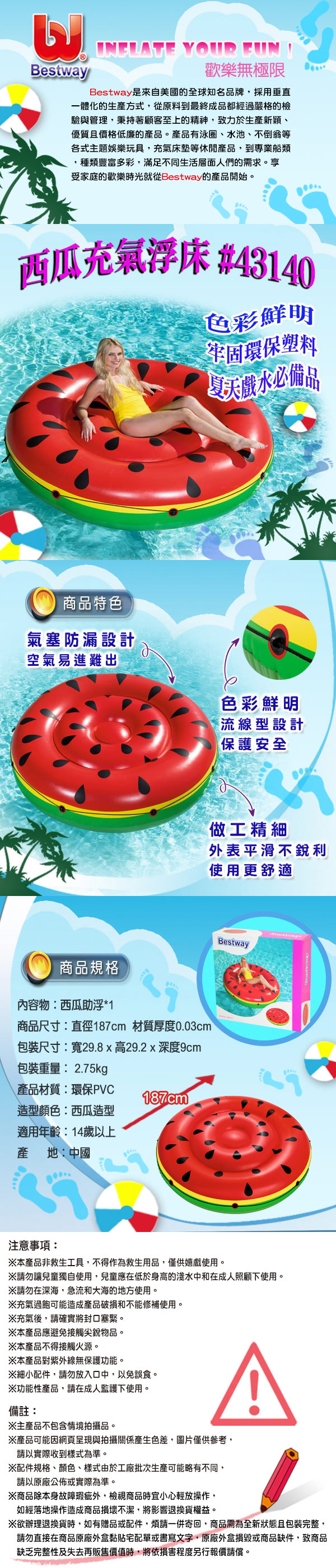 搶先評論了 “Bestway。西瓜雙人水上充氣浮排/浮床/氣墊43140”