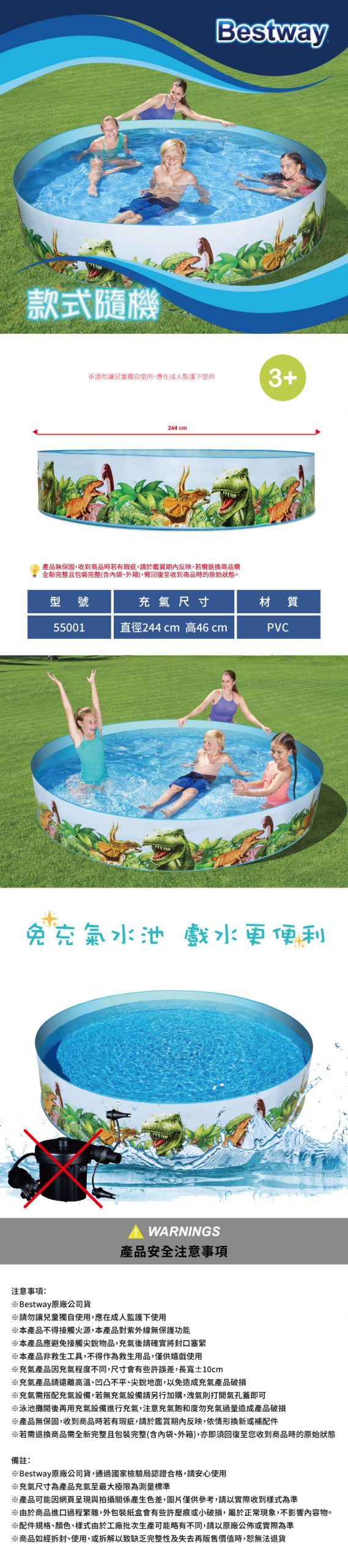 商品特色敘述: *水容量:1612升 *免充氣水池,戲水更便利 *適合3歲以上兒童 *輕巧好攜帶,室內外皆適用 *好清洗,外表平滑無突出物
