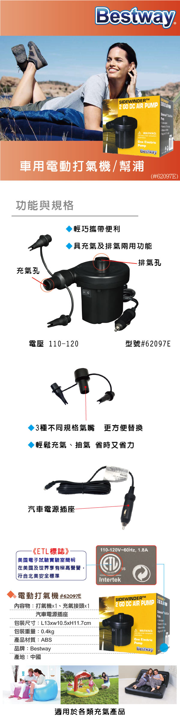 *輕巧攜帶便利 *具充氣及排氣兩用功能 *3種不同規格氣嘴 更方便替換 *輕鬆充氣、抽氣一舉兩得,不費力 *汽車電源插座 *適用於各類充氣產品 如:充氣床、充氣坐墊、充氣沙發、充氣泳池等