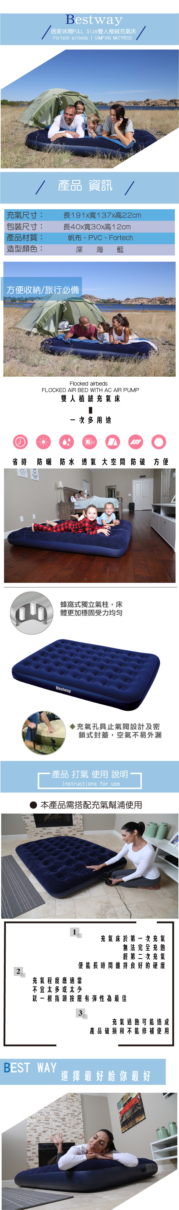 *蜂窩式獨立氣柱,床體更加穩固受力均勻 *柔軟舒適的植絨表面 *居家睡眠、外出旅遊、旅館加床、朋友寄宿,必備佳品 *室內、野營使用的理想選擇 *獨特雙層防漏氣嘴,輕鬆打氣,穩定防漏