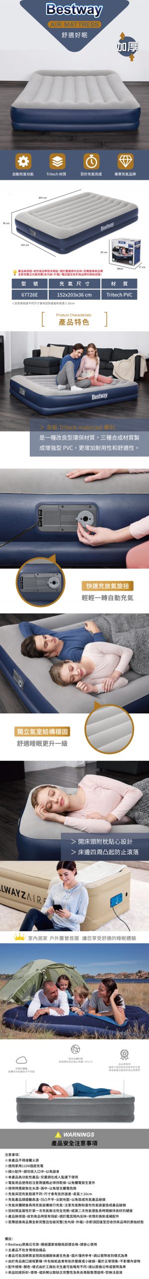 商品特色敘述: 配有自動充氣AC幫浦,百秒充氣完成 抗磨、高延展性的專利Tritech技術製成 工字式獨立氣柱,床體更加穩固受力均勻 床邊四周凸起防止滾落 床體加厚支撐力更強、更平穩,無論坐或躺,都可以平均受力 居家睡眠、外出旅遊、旅館加床、朋友寄宿,必備佳品 加大床面附枕設計舒適好眠