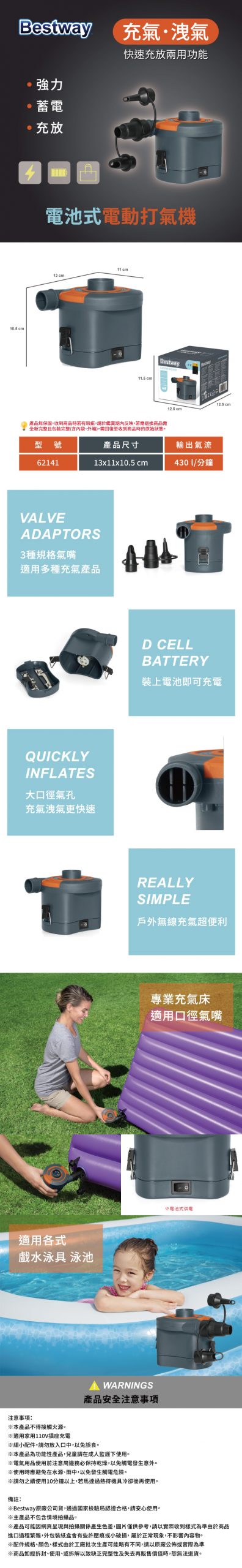 商品特色敘述: 裝上電池即可充電,輕巧攜帶便利 具快速充氣及排氣兩用功能 3種規格氣嘴,替換方便 大口徑氣孔,充氣、洩氣更快速 可用於充氣床、充氣玩具、充氣泳池等