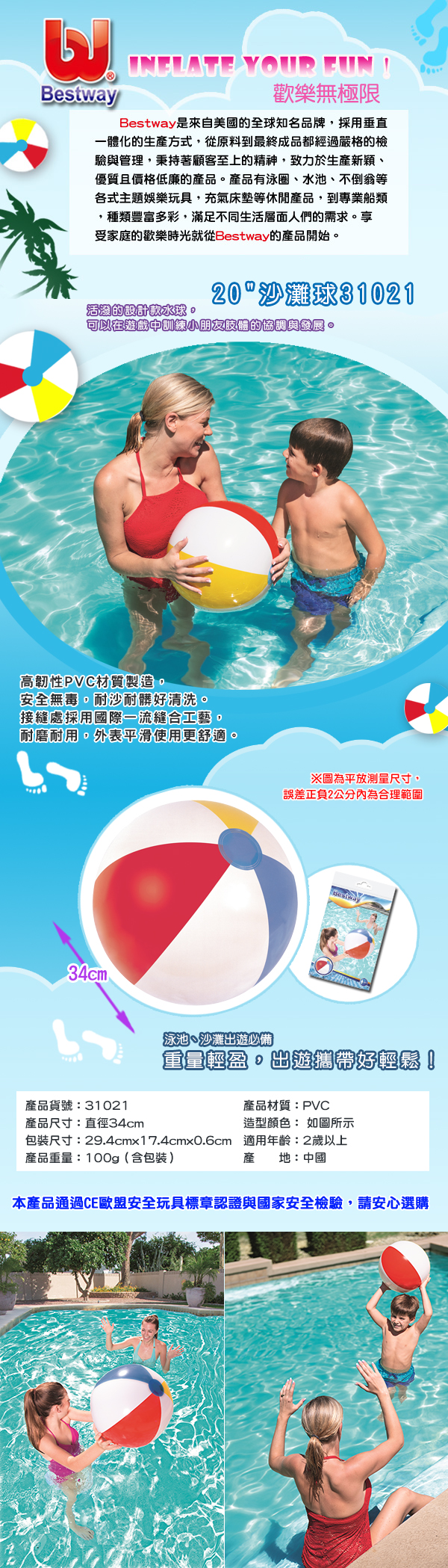 商品特色敘述: 色彩繽紛,夏日戲水好夥伴 具安全防漏充氣閥 使用塑料柔軟有彈性,不易損壞 高韌性PVC材質製造,安全無毒,耐沙耐髒好清洗 重量輕盈,外出攜帶輕鬆 外出戲水、沙灘必備,給戲水帶來更多歡樂。
