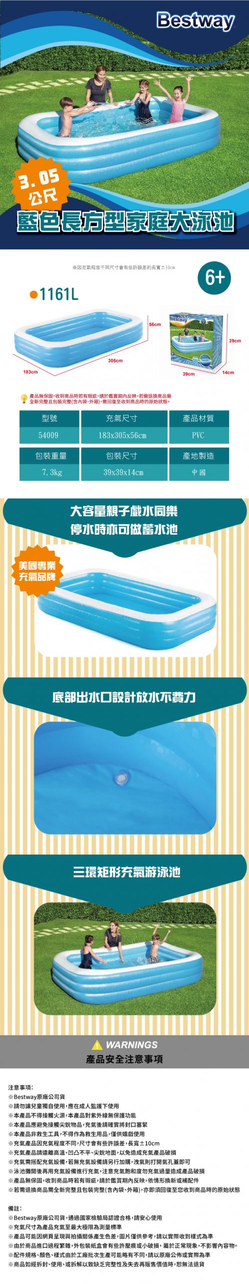 商品特色敘述: 美國專業充氣品牌 大容量停水時做蓄水池儲水 底部出水口設計放水不費力 表面強韌PVC製成不易破損 三環矩形充氣游泳池 親子家庭戲水同樂