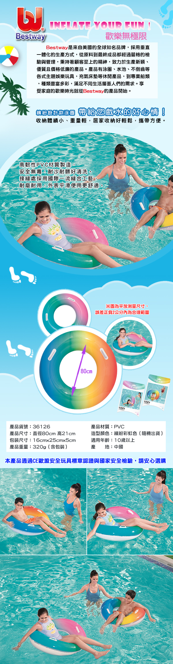 商品特色敘述: 親子同樂清涼一夏 環保PVC材安全無毒 絕美繽紛彩虹漸層,拍照打卡必備商品 雙安全手把設計,玩水更安全、更放心 手把可加裝水中拉繩,牽引帶領水中漫遊