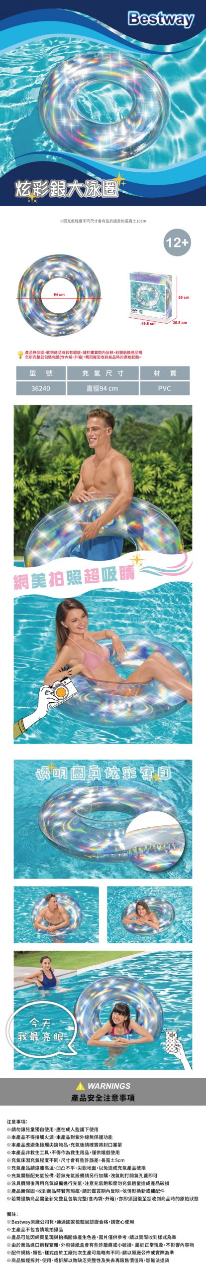 Bestway專業充氣品牌 華麗閃銀元素網美池吸睛必備 炫彩效果會在陽光下反射 安全防漏充氣孔,可適用於成年人 高韌性PVC材質製造,安全無毒,耐沙耐髒好清洗 環保PVC材質,安全無毒,耐沙耐髒好清洗 使用塑料柔軟有彈性,不易損壞