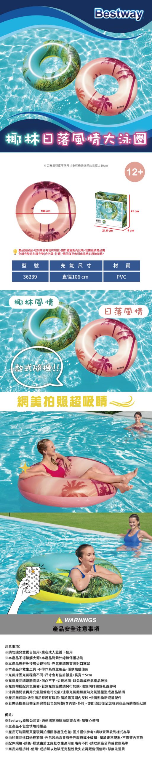 商品特色敘述: Bestway專業充氣品牌 椰林日落風情網美吸睛必備 安全防漏充氣孔 高韌性PVC材質製造,安全無毒,耐沙耐髒好清洗 環保PVC材質,安全無毒,耐沙耐髒好清洗 使用塑料柔軟有彈性,不易損壞