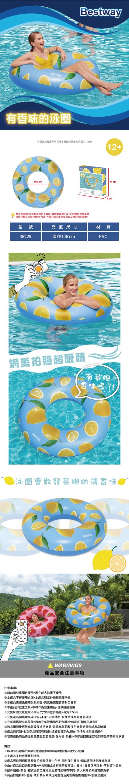 商品特色敘述: Bestway專業充氣品牌 覆盆子網美吸睛必備 泳圈有清爽檸檬的香氣 安全防漏充氣孔 環保PVC材質,安全無毒,耐沙耐髒好清洗 使用塑料柔軟有彈性,不易損壞