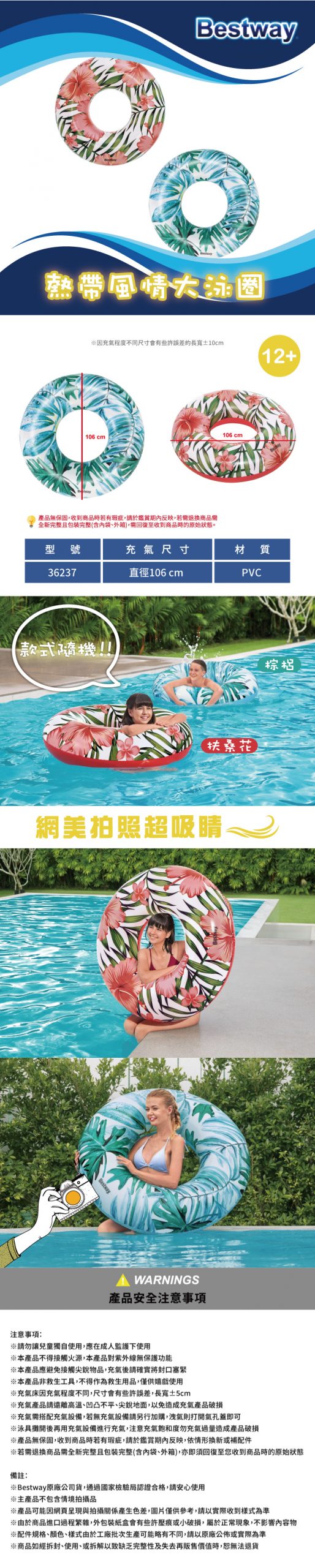 商品特色敘述: Bestway專業充氣品牌 棕梠扶桑花圖案網美吸睛必備 安全防漏充氣孔 高韌性PVC材質製造,安全無毒,耐沙耐髒好清洗 環保PVC材質,安全無毒,耐沙耐髒好清洗 使用塑料柔軟有彈性,不易損壞
