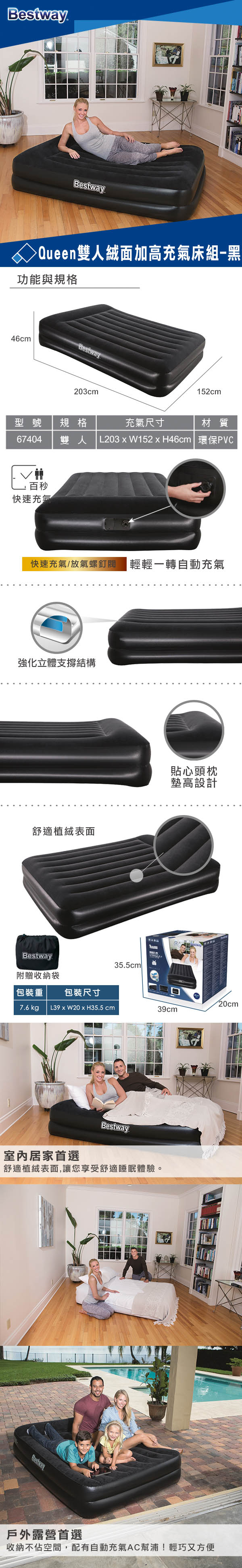 商品特色敘述: 頂部貼心10cm頭枕設計,不需另行購買充氣枕,使用上更方便 床體表面採用優質植絨觸感細柔 配有自動充氣AC幫浦,百秒充氣完成 附收納防塵袋方便不佔空間 I-beam表面採用特殊的I形結構,由數種高強度聚酯纖維製成,提供了完美的舒適性和支撐性