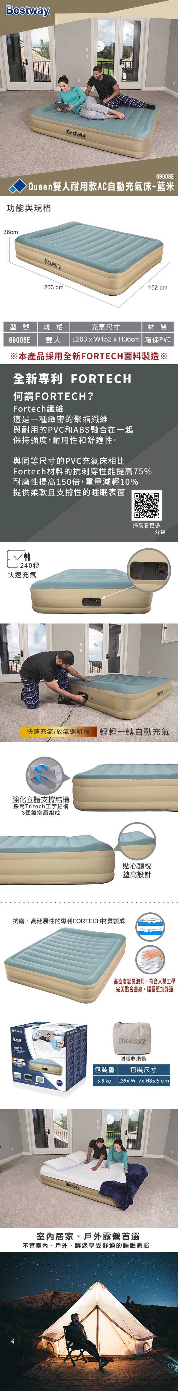 商品特色敘述: 附收納防塵袋方便不佔空間 頂部貼心10cm頭枕設計,不需另行購買充氣枕,使用上更方便 床邊四周凸起設計防止滾落 配有自動充氣AC幫浦,百秒充氣完成 抗磨、高延展性的專利FORTECH材質製成 備用充、放氣孔,沒電也可以外接充氣裝置使用 I-beam表面採用特殊的I形結構,由數種高強度聚酯纖維製成,提供了完美的舒適性和支撐性