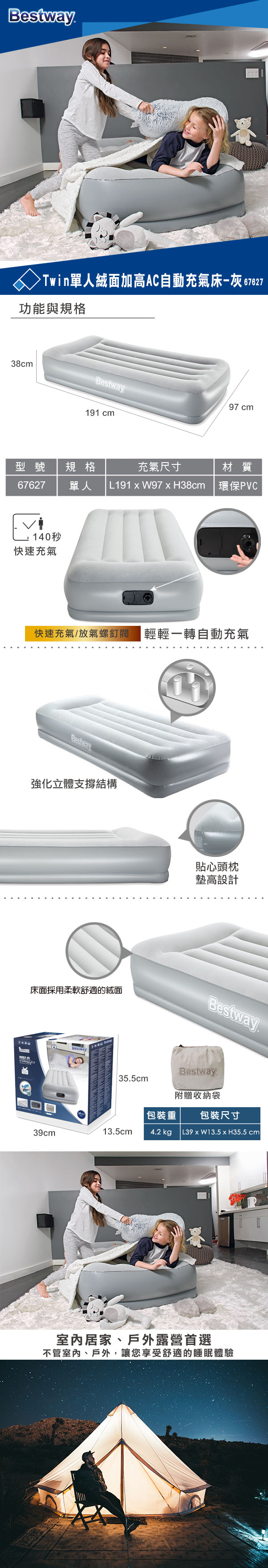 商品特色敘述: 附收納防塵袋方便不佔空間 頂部貼心10cm頭枕設計,不需另行購買充氣枕,使用上更方便 床面採用柔軟舒適的絨面 床體加高設計,可輕鬆上下床 配有自動充氣AC幫浦,百秒充氣完成 I-beam表面採用特殊的I形結構,由數種高強度聚酯纖維製成,提供了完美的舒適性和支撐性