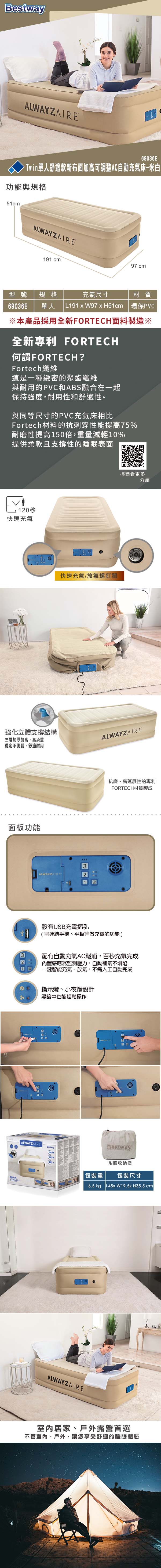 Bestway。Twin單人舒適款新布面加高可調整AC自動充氣床-米白 69036E