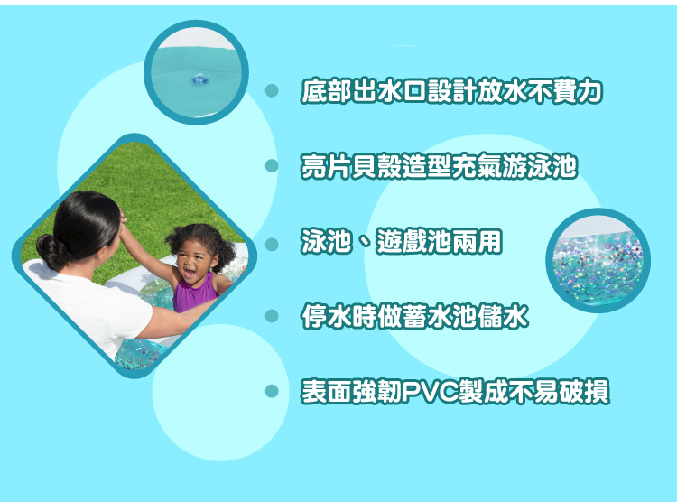 搶先評論了 “Bestway 亮片貝殼充氣泳池 150x127x43cm”