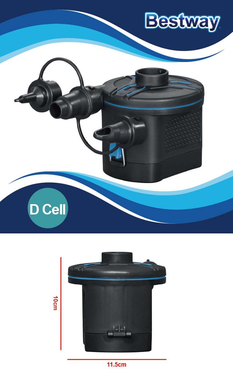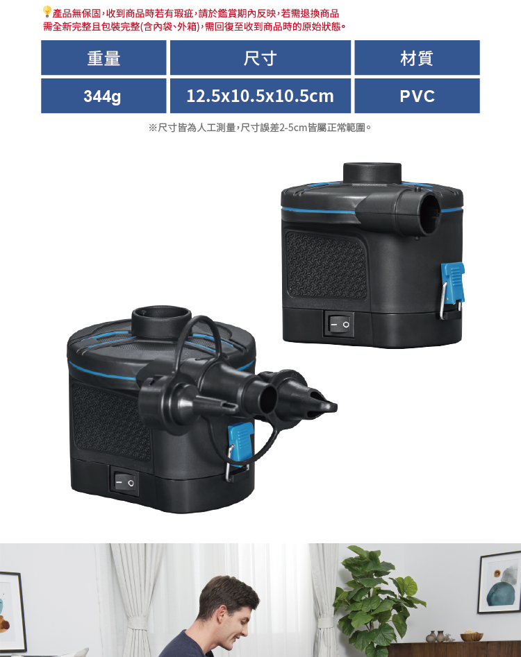 電池供電輕巧攜帶便利 具快速充氣及排氣兩用功能 3種規格氣嘴,替換方便 大口徑氣孔,充氣、洩氣更快速 可用於充氣床、充氣玩具、充氣泳池等