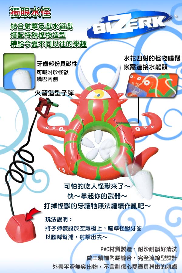 結合射擊及戲水遊戲,搭配特殊怪物造型,帶給今夏不同以往的樂趣 *牙齒部份具磁性,可吸附於怪獸嘴巴內側 *火箭造型子彈,水花四射的怪物觸鬚(需連接水龍頭),增添更多趣味性 *PVC材質製造,耐沙耐髒好清洗 *做工精細内翻縫合,完全流線型設計