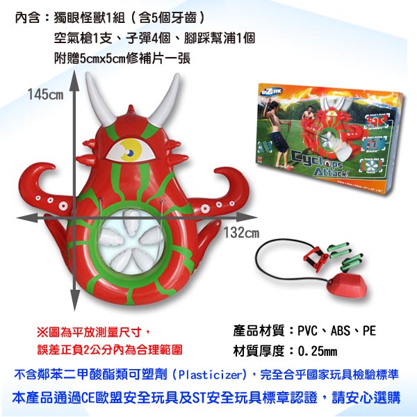 玩法說明: 將子彈裝設於空氣槍上,瞄準怪獸牙齒,以腳踩幫浦,射擊出去~