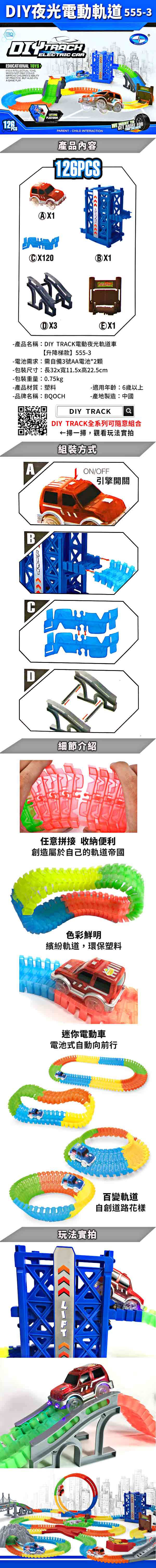 *夜光效果:軌道在陽光下照耀一段時間後在黑暗處可散發亮眼光芒 *燈光效果:明亮的LED燈讓軌道車在黑暗中發光 *軌道採用不同段顏色,刺激視覺觀感 *輕鬆組裝,變化無限